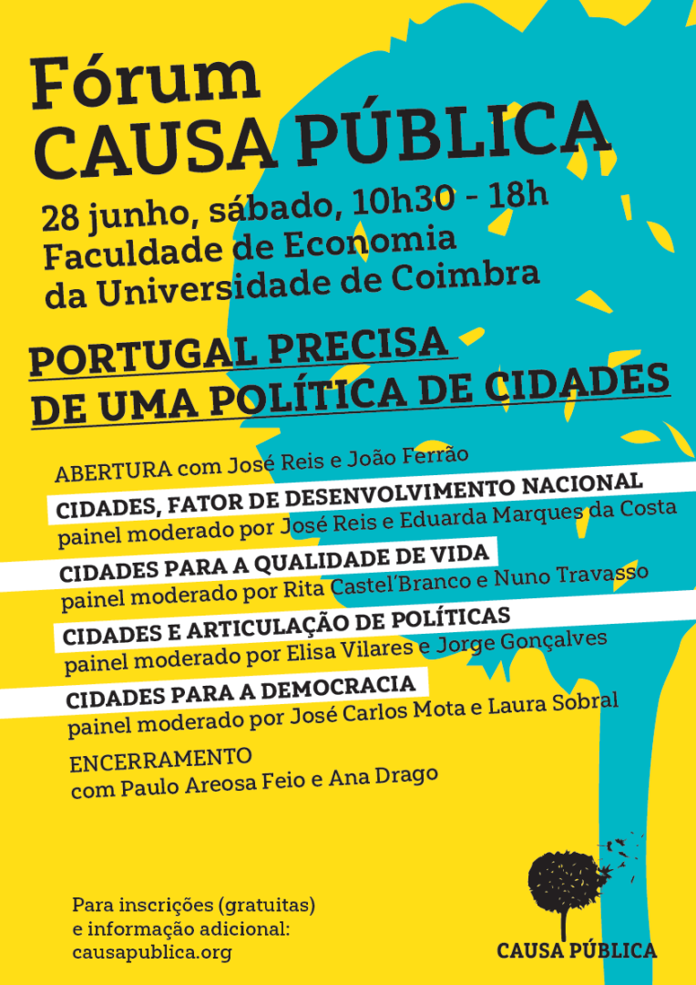 No sábado, dia 28 de junho, realiza-se o Fórum Anual da Causa Pública, na Faculdade de Economia da Universidade de Coimbra, a partir das 11h. Este ano, o fórum será dedicado às políticas urbanas, no âmbito das eleições autárquicas que se aproximam. Discutiremos: